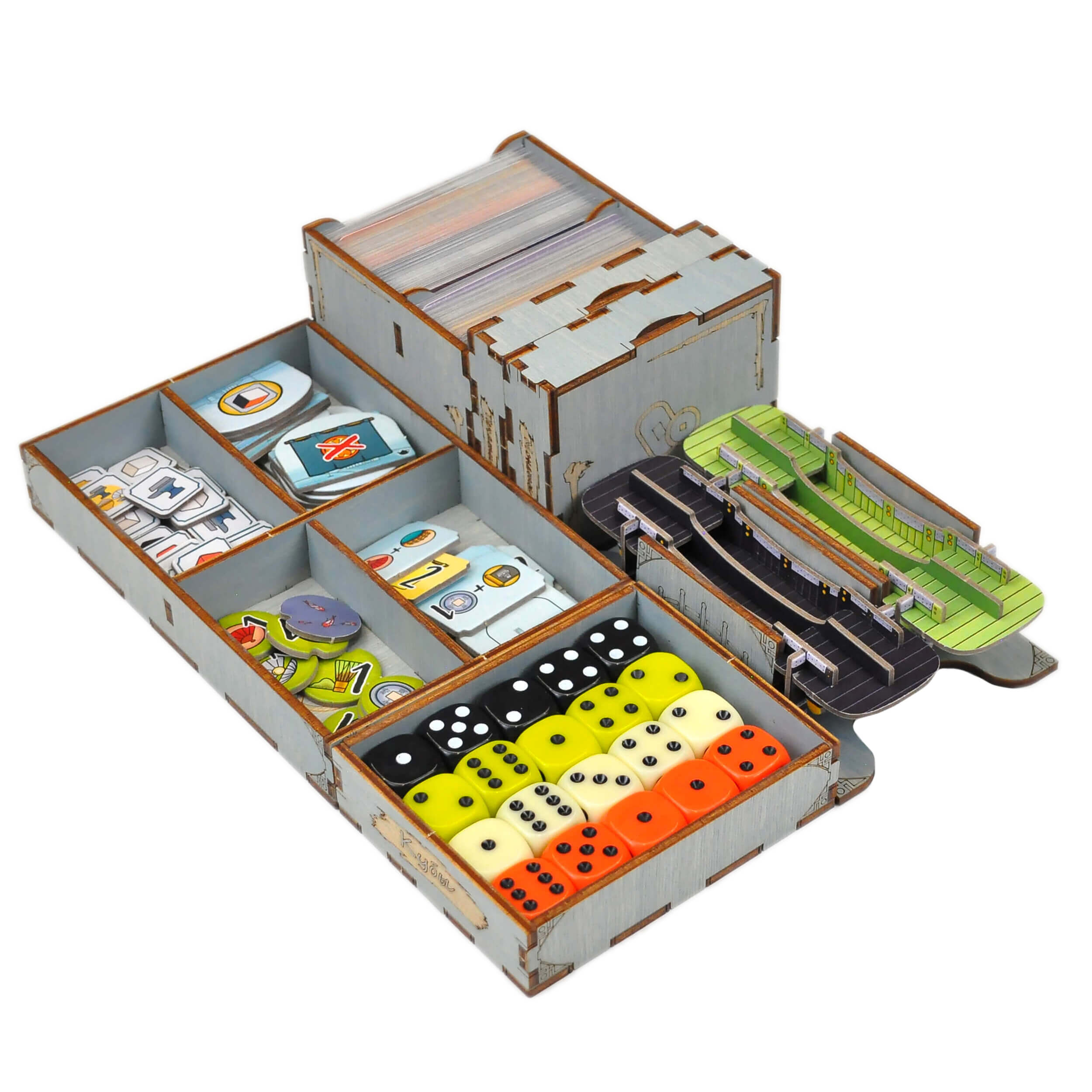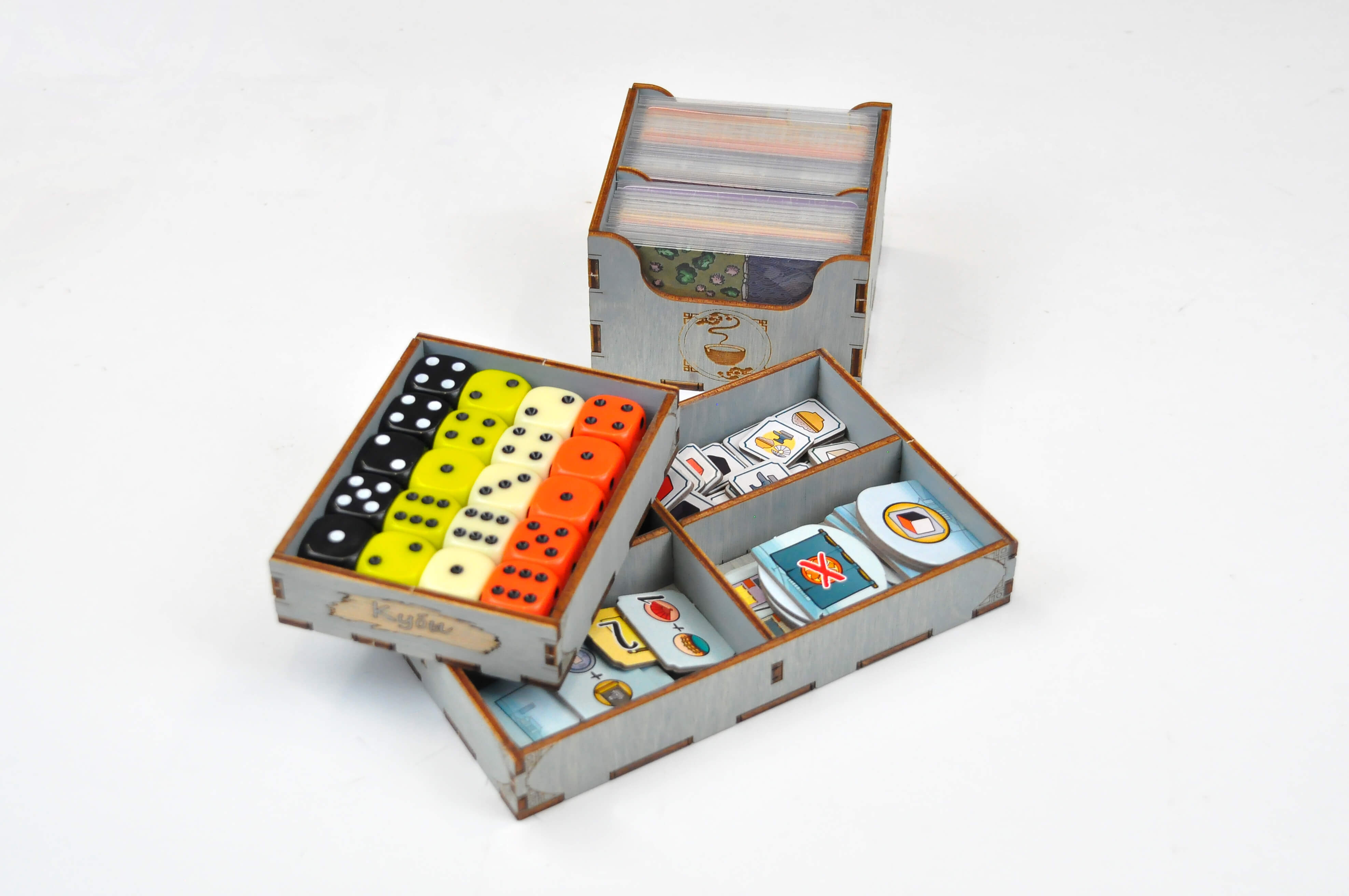 - 1 лоток для жетонов тренировочных площадок, кувшинок, кубиков в церемоний.;