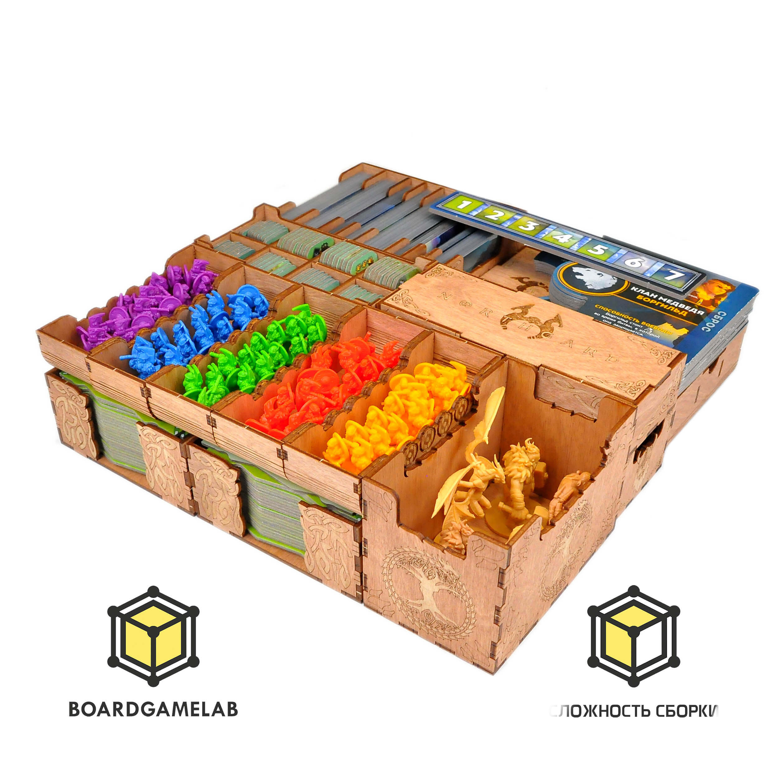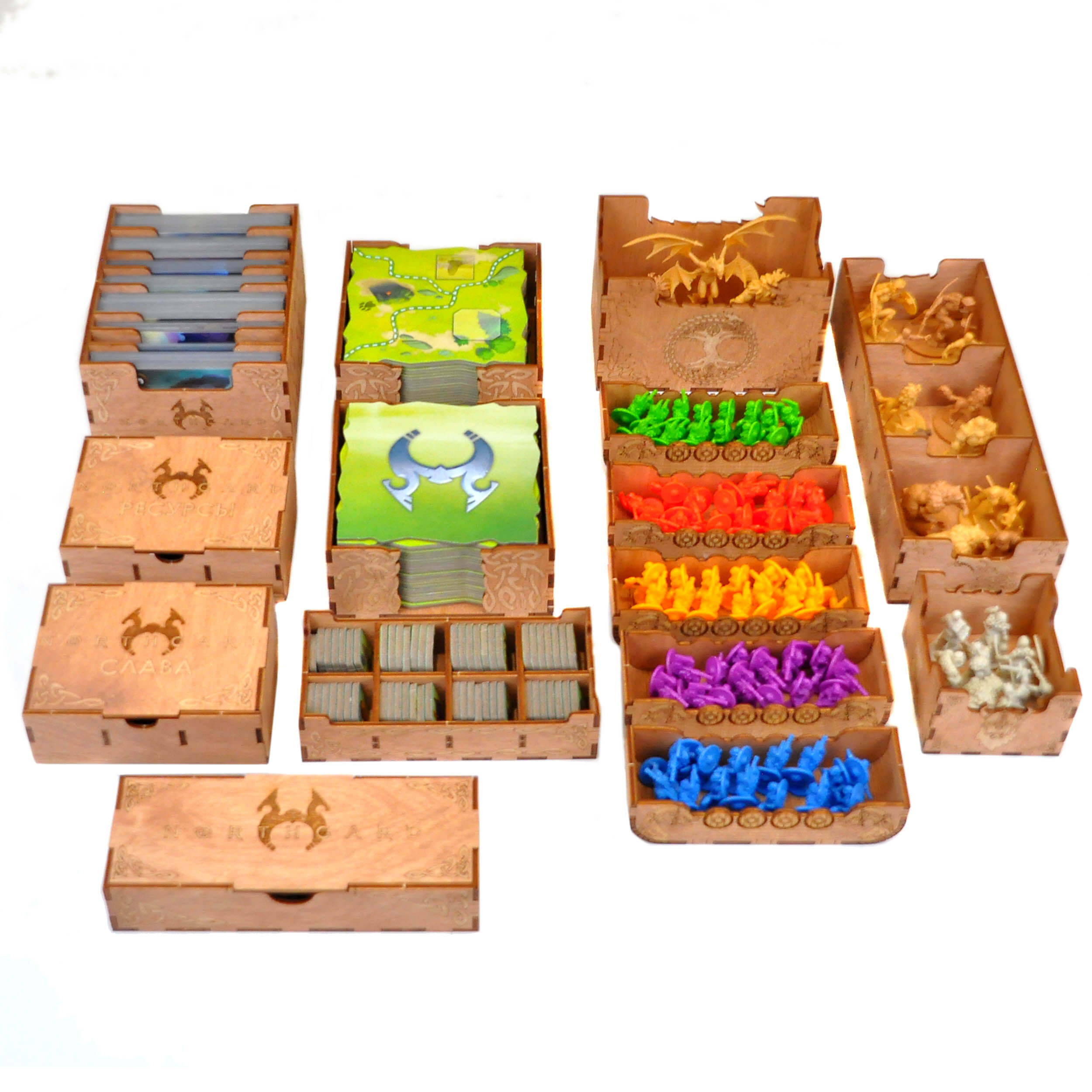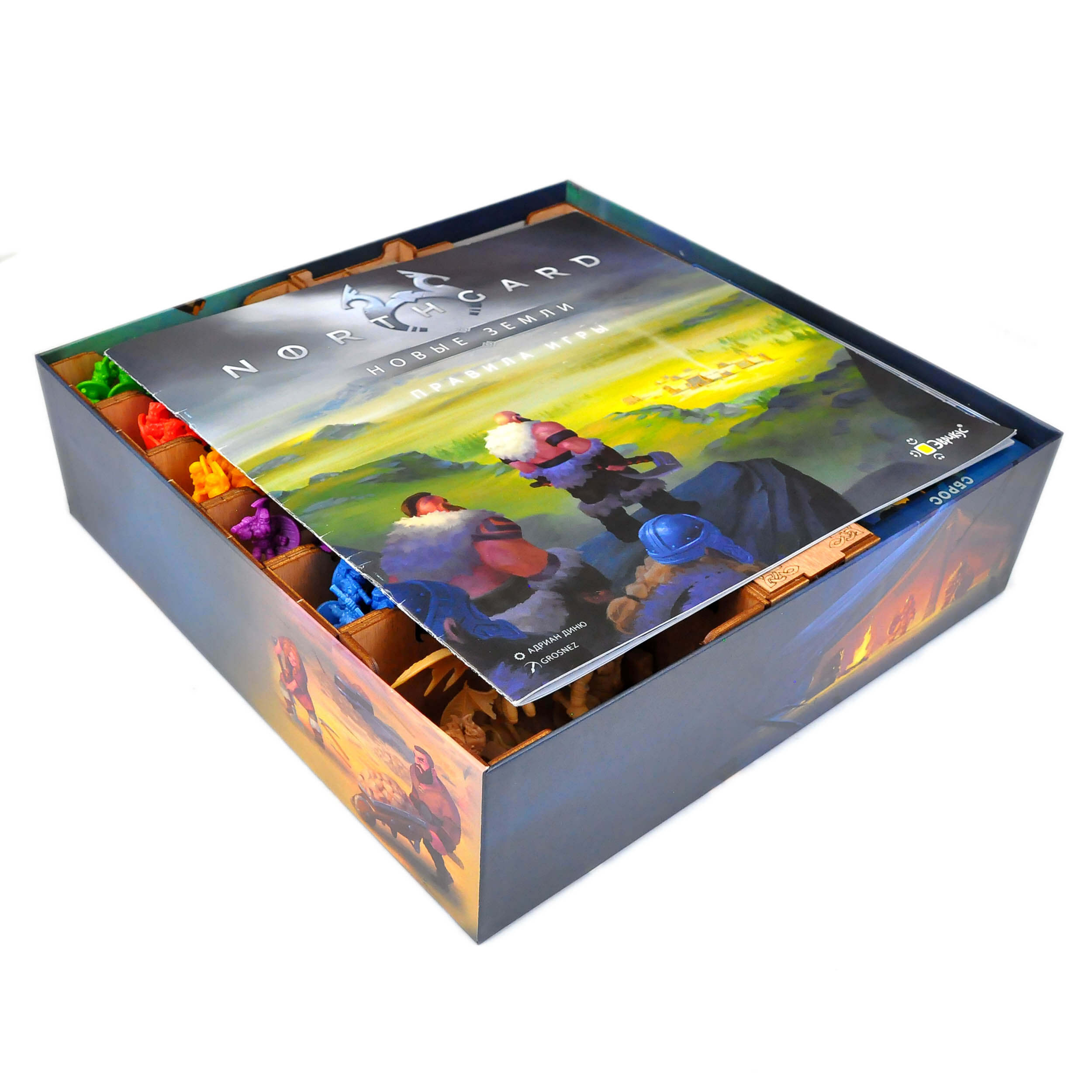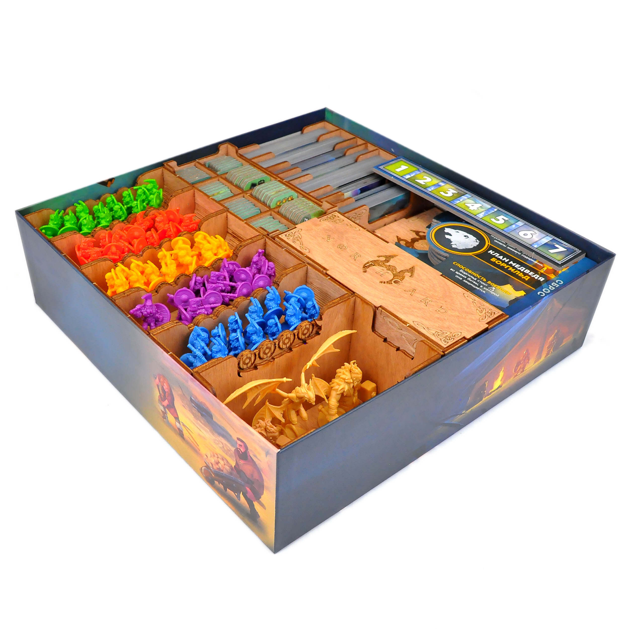Органайзер для настольной игры Норсгард совмещает базовую игру, все вышедшие дополнения и промо материалы;