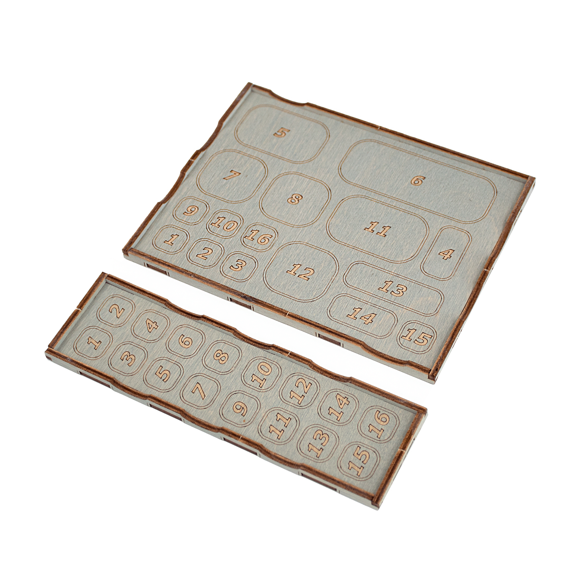 - 1 планшет для удобного расположения на игровом столе всех карт персонала и достижений, занимающий в 10 раз меньше места на игровом столе, в отличии от базовой раскладки;